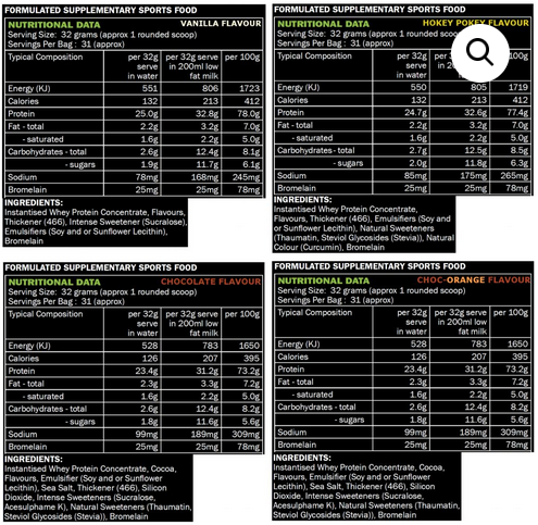 - High in protein, a serve provides 31g protein mixed in 200ml milk. Low carb, low fat, low sodium